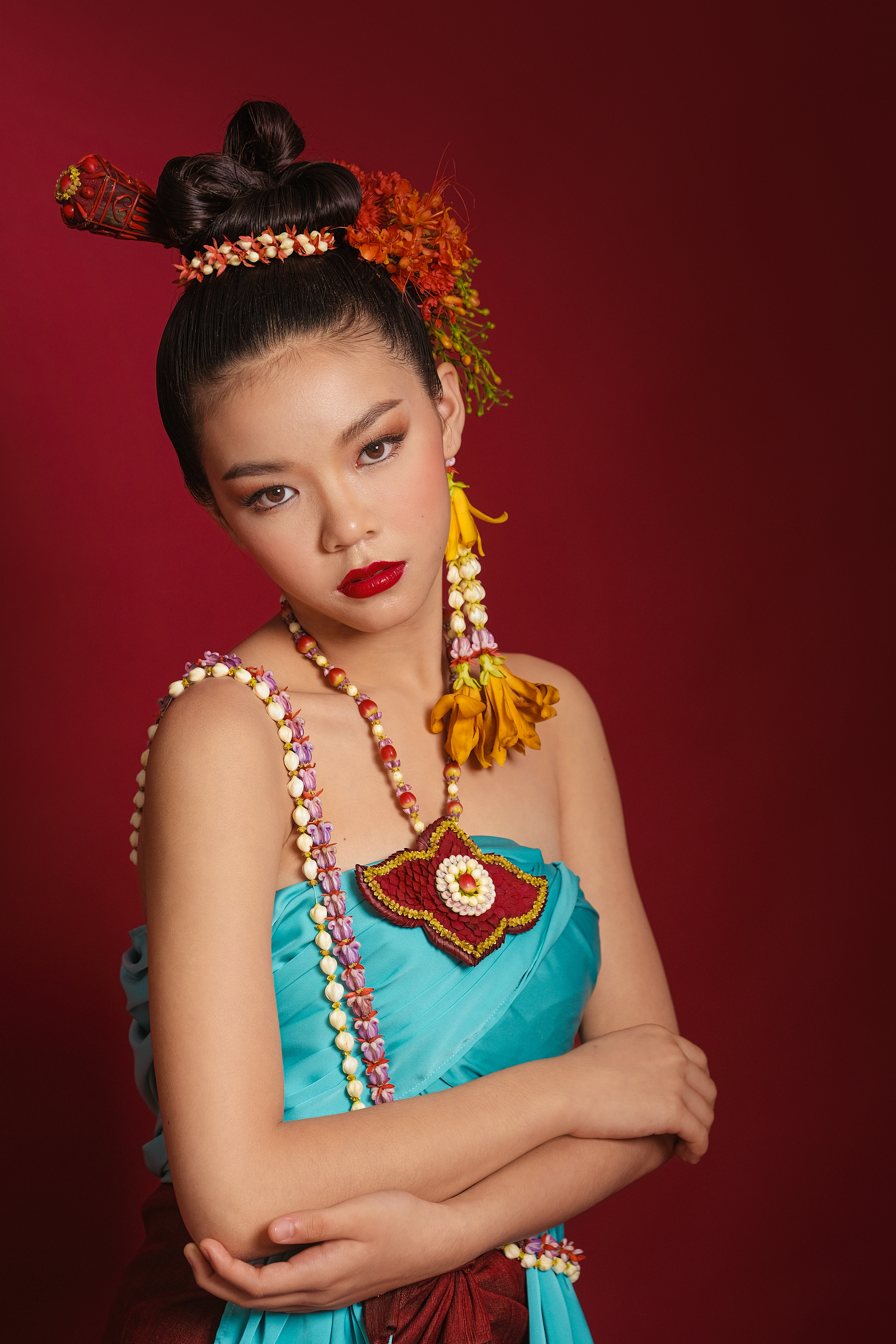 ผ้าซิ่น ตระกูลเชียงแสน โดยร้าน "บุญยวง" ทอมือพิเศษจะจากผ้าต้นแบบลวดลายดั้งเดิม นำมาแต่งกายโดยมีเครื่องประดับดอกไม้สดจาก "Prince Parin" ตกแต่งอย่างสวยงามปราณีต